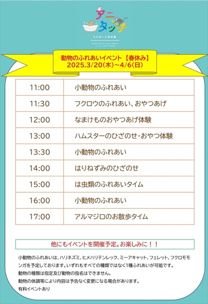 決まった時刻に、通常ではできない動物とのふれあいイベントがあります。
