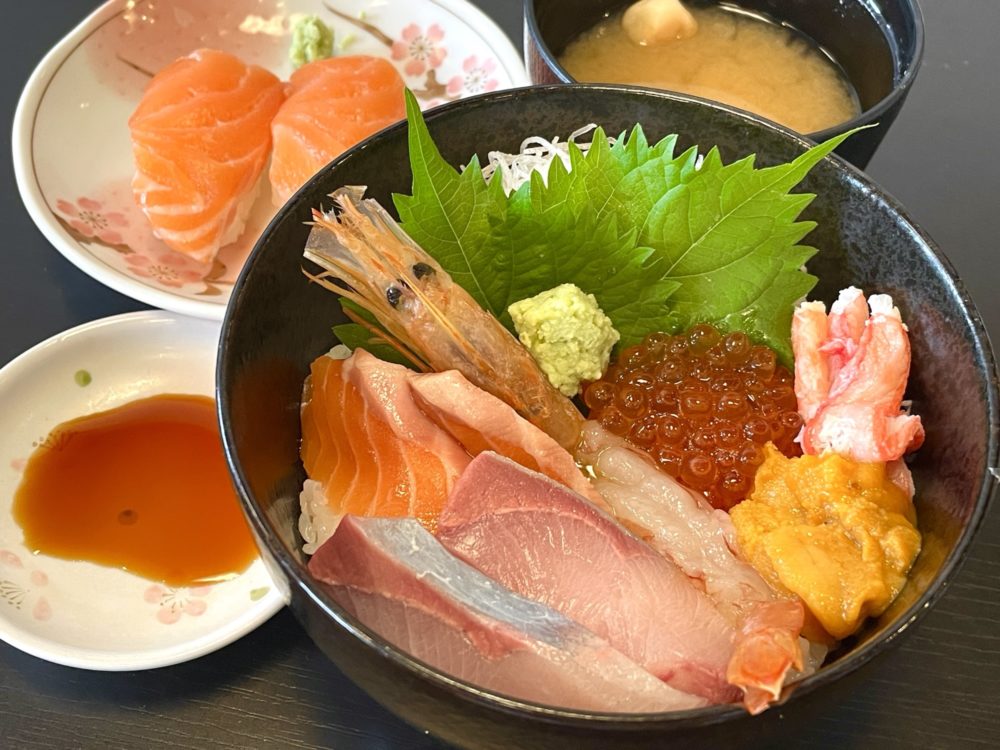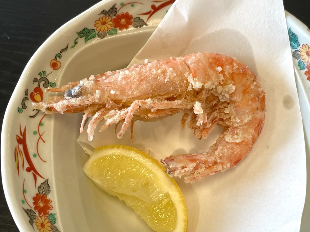 とろサーモン握り(4貫)、アジの塩焼き、エビの唐揚げひと口。