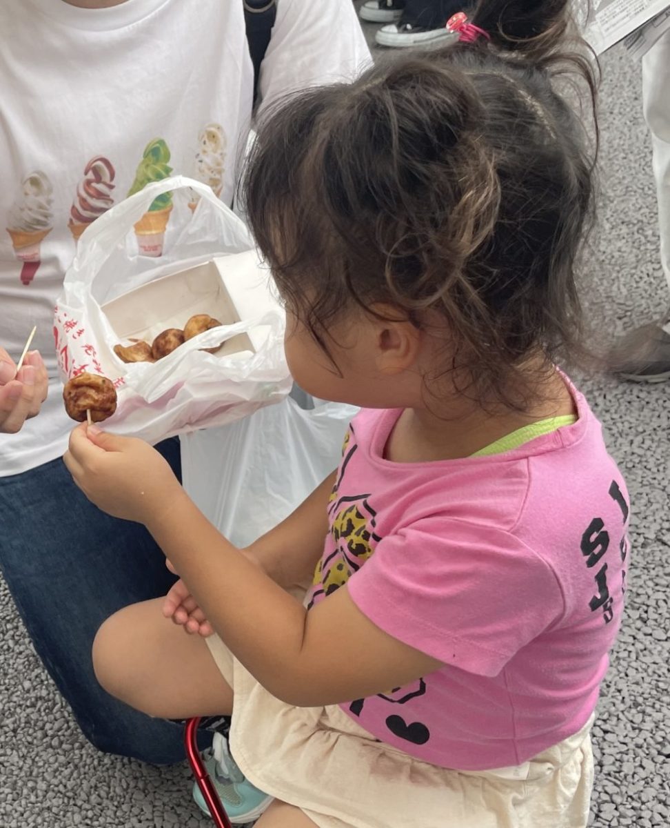 並びながら腹ごしらえ。タコ焼きとコンビニのおにぎり。